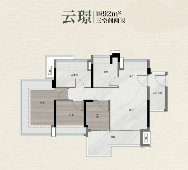 建面 89㎡三房两厅两卫:总价 238-250 万元,堪称 “刚需入门神户型”。东南朝向,采光充足,L 型双开间阳台能改造成约 4.4㎡的 + 1 房,不管是做茶室、储物间还是儿童游乐区都非常实用。玄关设有独立收纳空间,小户型也能告别杂乱,特别适合首次买房的年轻家庭。