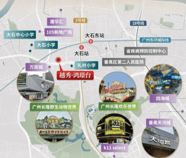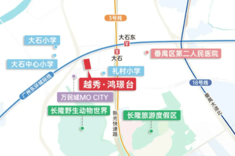 除了配建小学,项目周边的教育资源也非常丰富。335 米处有大石礼村小学,3 公里内还有大石中心小学、大石中学等公办学校,以及番禺广雅实验学校等优质民办校,从小学到中学的教育需求都能满足,家长不用为择校问题太过操心。
