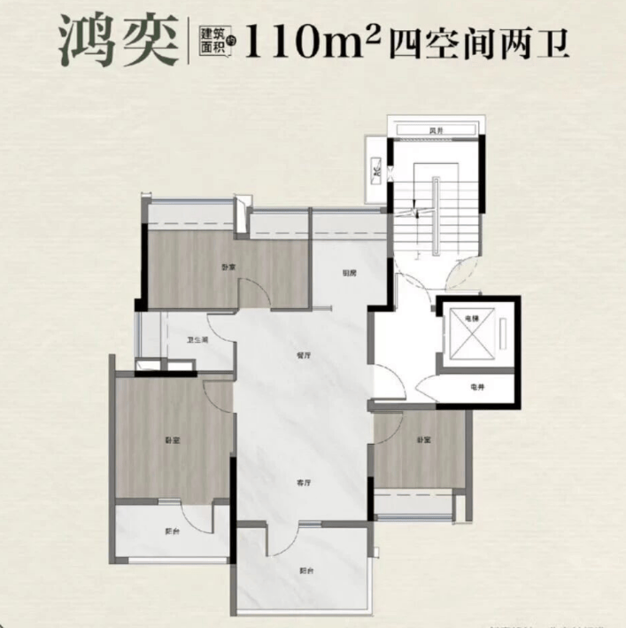 建面 110㎡四房两厅两卫(中户):总价 295-320 万元,正南朝向,类四叶草布局,每个房间都相对独立,家庭成员居住互不干扰,特别适合二胎家庭或与父母同住的家庭。
