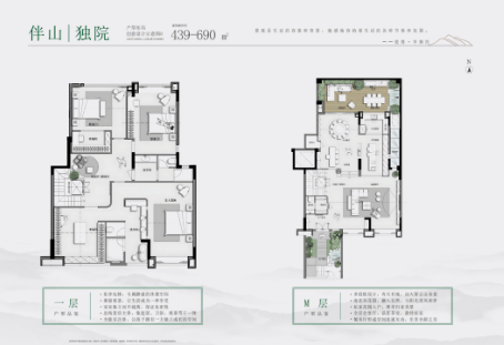 建面约439-690㎡的伴山独院户型,提供了独立的前庭后院和专梯专户设计,使每户都能拥有绝佳的观山视野,满足多代同堂或高端社交需求。