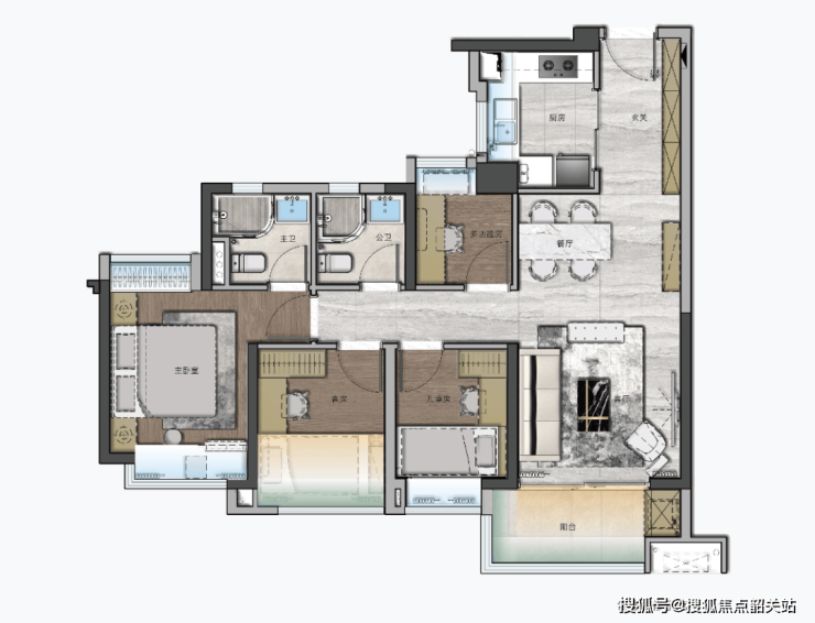 105㎡四房户型:105㎡的户型非常适合三代同堂的大家庭,空间更为富足。每个房间的设计都经过精心布局,且公卫和主套卫生间均采用了干湿分离设计,提高了居住的舒适性和安全性。