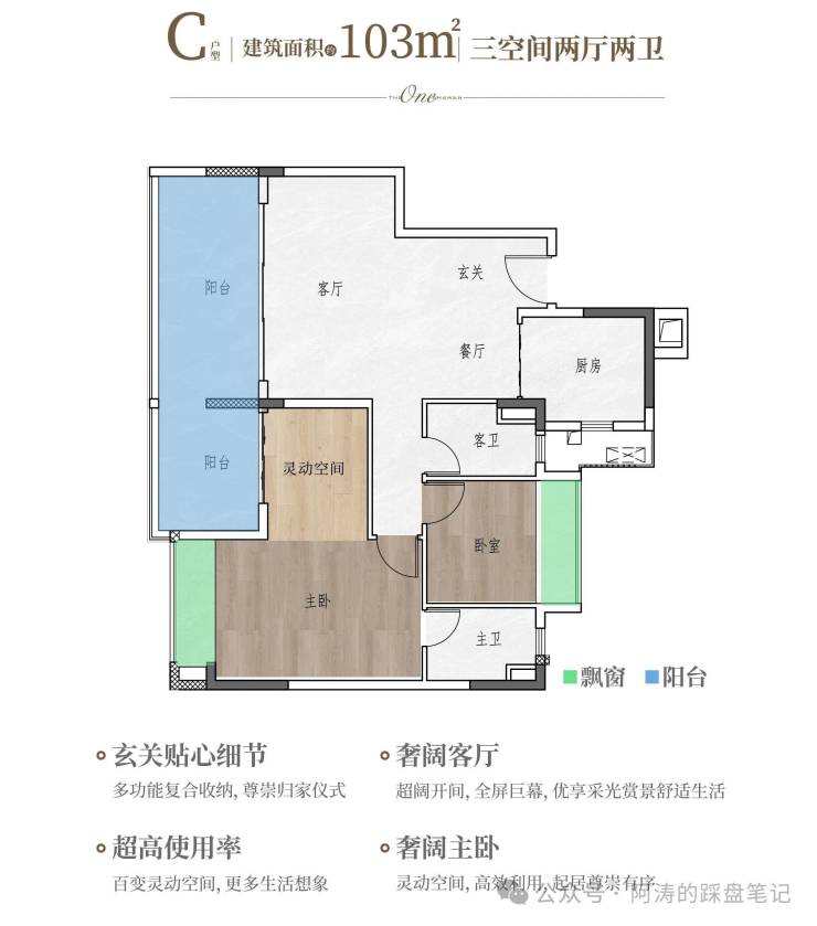 96㎡/103㎡:舒适三房,空间宽敞,动静分区,适合三口之家或二胎家庭。