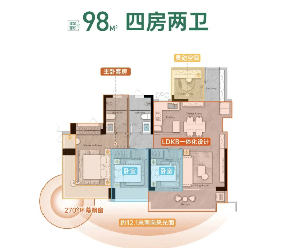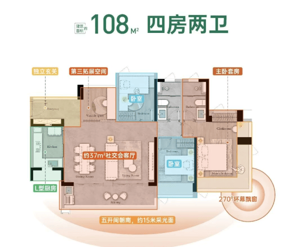 约108平方米四房两卫:阔绰的大四房设计,主卧套房配置,采光通风极佳,适合追求高品质生活的改善型家庭。