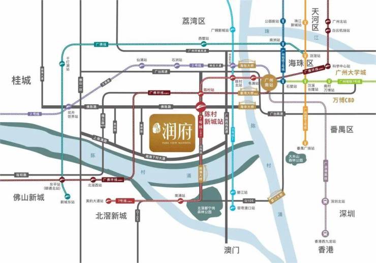 顺德润府的交通网络十分发达,周边有三条地铁线和双城轨线路经过,实现了半小时广佛生活圈的目标。特别是广州7号线锦龙站近在咫尺,四站即可到达广州南站,方便居民快速抵达长隆、万博、大学城等重要地点。此外,佛山地铁2号线和11号线进一步加强了与佛山其他区域的联系,而广佛环线则使居民能够轻松前往海珠琶洲、天河金融城等地。