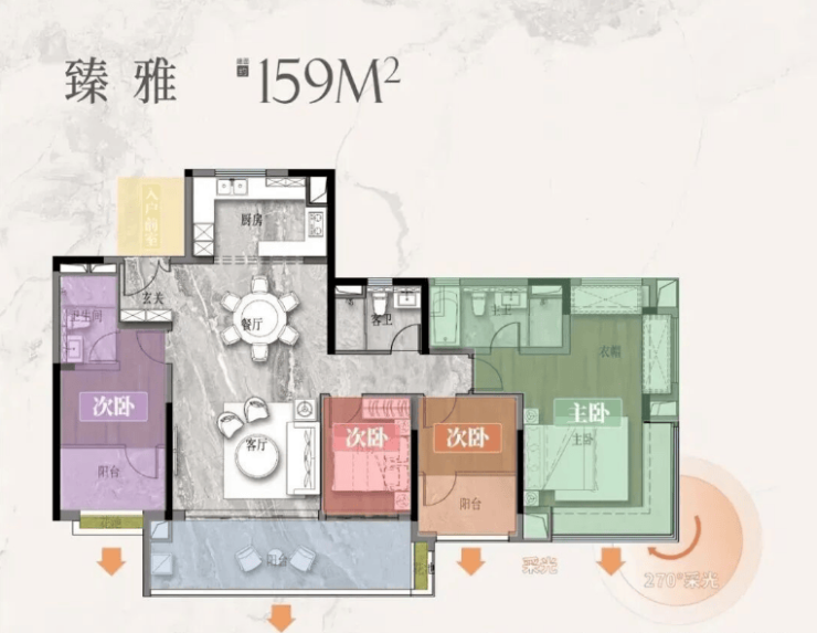 加粗 159㎡四房三卫,改善顶配,五开间朝南 + 270° 飘窗