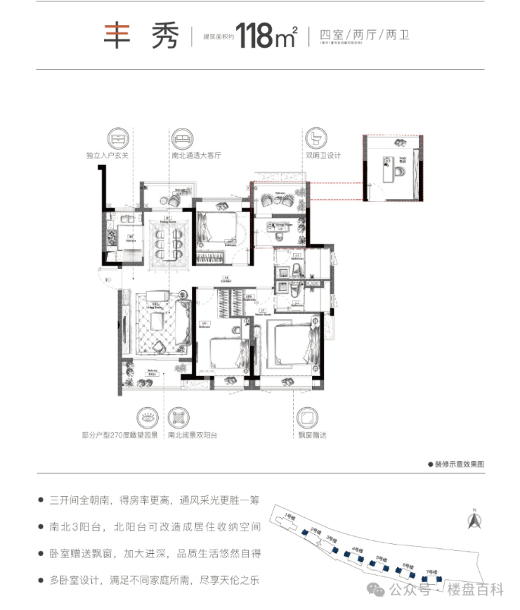 超高使用率:89㎡三房、118㎡四房,得房率约 80%,在同面积段户型中,空间利用率领先,性价比极高。