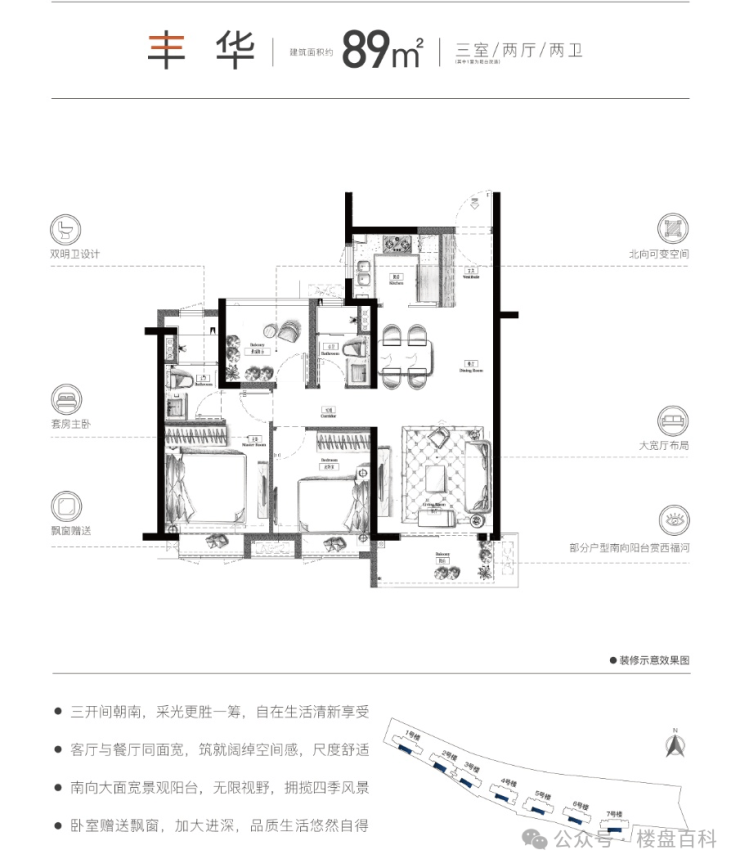 超高使用率:得房率约 80%,在 89㎡面积内打造三房两厅两卫,空间利用率极高,无浪费面积,功能性强,满足三口之家、二胎家庭基础居住需求。