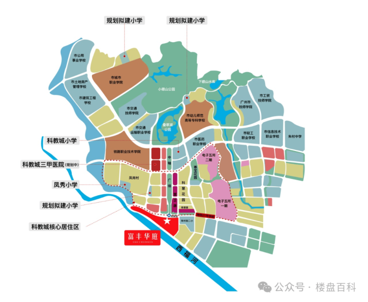 规划配套完善:根据《广州科教城城市设计及控制性详细规划优化》,片区规划 11 所中小学(7 所小学、3 所中学、1 所九年一贯制学校)、10 所幼儿园,规划三甲综合医院、大型商业综合体、生态公园等全维配套,未来将成为广州东部配套最完善的板块之一。