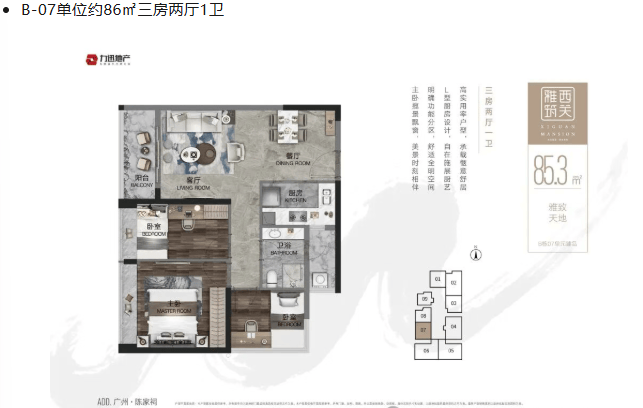 B-07单位约86㎡三房两厅一卫,则更适合刚需家庭或者刚改家庭,这款户型空间布局合理,动静分离,客厅宽敞明亮,搭配大阳台,采光和通风效果极佳,既能满足日常起居,也能兼顾家庭聚会、孩子玩耍等需求;三个卧室布局合理,空间大小适中,能满足家庭的居住需求,不管是三口之家,还是三代同堂,都能轻松居住,实用性和舒适性兼备。