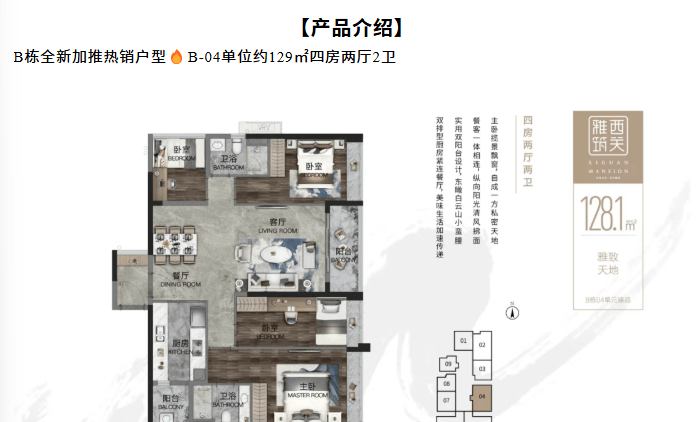 B-04单位约129㎡四房两厅两卫,是近期加推的热销户型,这款户型空间宽敞舒适,布局合理,能满足改善家庭的居住需求。户型设计方正,动静分离,客厅搭配大阳台,视野开阔,既能俯瞰社区园林美景,也能远眺城芯风光;四个卧室空间宽敞,采光充足,主卧配备独立卫浴,私密性和舒适度拉满,能为主人提供静谧的休息空间;厨房、卫生间布局合理,实用性极强,让家人的日常生活更加便捷。
