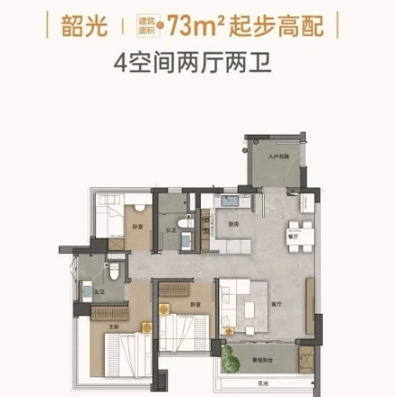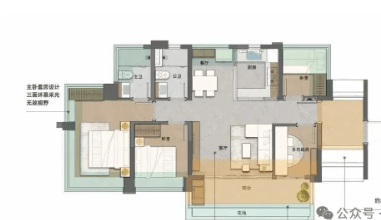 更令人惊喜的是,该户型采用LDKB一体化设计(客厅、餐厅、厨房、阳台打通),客厅开间约4米,搭配入户花园,既提升空间感,又增强生活仪式感。而建面约87㎡的四房户型,则配备约12㎡的入户花园,6.3米宽景阳台连通次卧,甚至可灵活改造为五房,满足多孩家庭或三代同堂的多元需求。