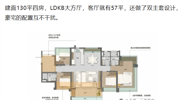 此外,项目还推出91㎡、109㎡、130㎡等多款四房产品,均实现五开间朝南、南北对流、横厅或双主套等高端配置。尤其是130㎡户型,LDKB大方厅面积达57㎡,双主卧套房设计,私密性与舒适度兼备,堪称“入门级豪宅”。