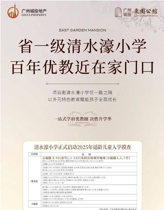 叁:一所优质的学校的更是价值的基本盘教育配套堪称卓越,从地段招生范围来看,小学对口省一级百年名校清水濠小学,在家长圈口碑极佳,认可度高。初中通过越秀区电脑派位,对口初中可能包括省实中学(中山四路校区)、执信中学(水荫路校区)、十六中、培正中学等优质学校(具体以教育局当年政策为准),形成 12 年优质教育闭环,越秀区学区含金量位居全广州 TOP1,为孩子的成长提供了坚实的教育保障,让家长无需为子女教育问题担忧。