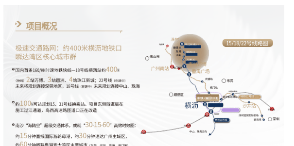 公共交通:地铁18号线横沥站距离项目约1.5公里,该线路为湾区南北快线,3站到琶洲、4站到珠江新城,未来还将延伸至中山、珠海。此外,规划中的15号线(南沙环线)也将设站附近,进一步强化区域通勤能力。