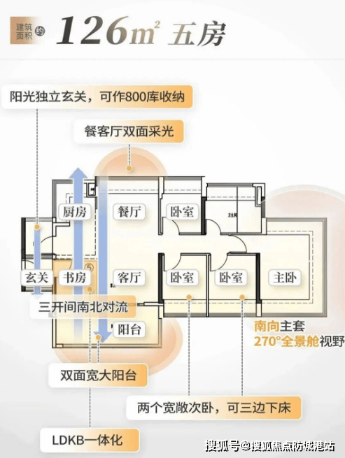 126㎡四房:双阳台设计,主卧三面通透无柱化飘窗,适配三代同堂需求。