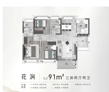 91㎡户型:做到四开间朝南,最大化引入自然光线,搭配 U 型厨房设计,操作动线合理,小户型也能拥有舒适的烹饪与居住体验,非常适合年轻刚需家庭;