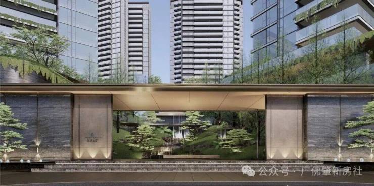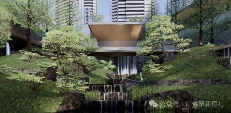 小区门庭落成15米落差瀑布,五棵悬崖式迎客黑松作揖相应,归家仪式感满满
