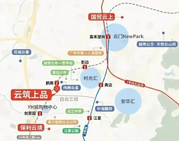 云筑上品位于白云设计之都核心区,直线距离地铁2号线江夏站800米,14号线彭边站1公里,30分钟可达珠江新城,20分钟直达白云机场。根据《广州市轨道交通线网规划(2025-2035)》,板块内还将新增1条地铁线路(规划中),未来通勤效率进一步提升。