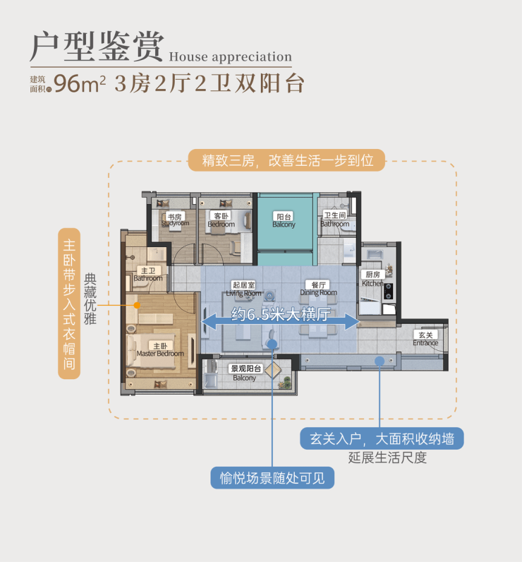 主力户型集中在75至98㎡之间,全部为精装交付,采用两梯六户设计。以96㎡四房为例,做到了南北通透,客厅面宽约6.5米,形成开阔的大横厅格局;主卧带步入式衣帽间,在同面积段产品中并不多见。86㎡的三房则主打南向园林景观,三开间朝南,客厅开间约3.5米,采光充足。即便是77㎡的入门级三房,也通过合理布局实现了高得房率,客厅开间达3.4米,兼顾实用性与舒适感。所有户型均注重动静分区,避免生活动线交叉。