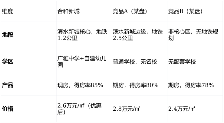 “竞品B价格虽低,但学区、地段、产品均弱于合和新城;竞品A价格高且为期房,风险更大。合和新城是‘均衡型选手’,适合追求‘确定性’的购房者。”