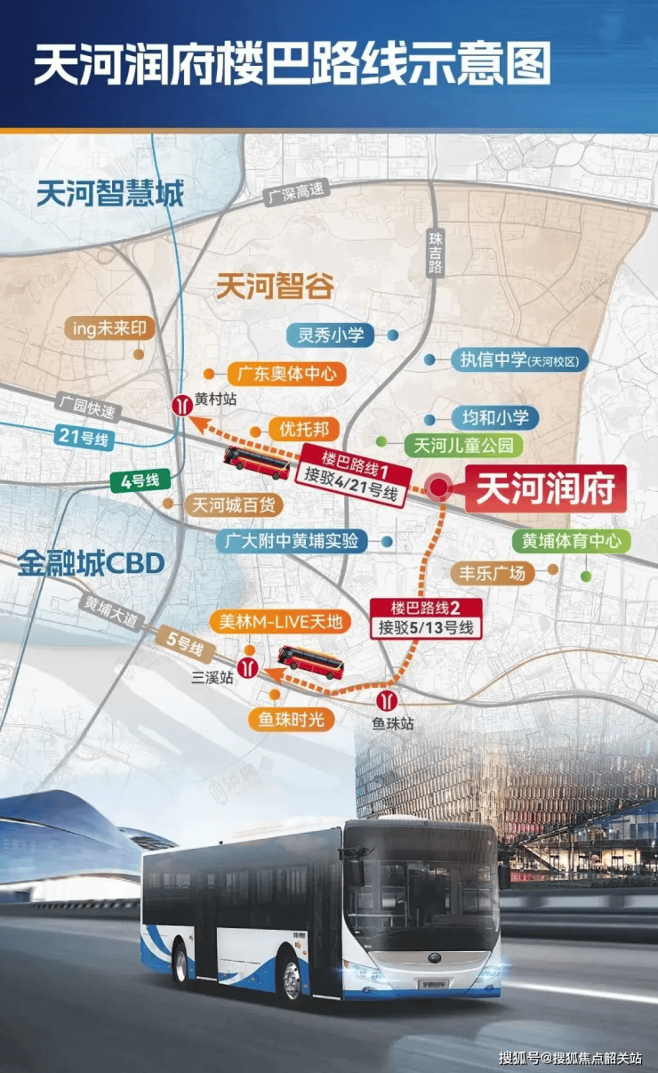 地铁:项目直线距离21号线天河智慧城站约1.2公里(车程5分钟),3站到金融城,6站到珠江新城;