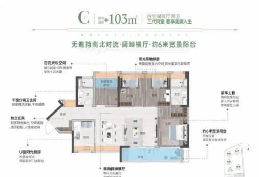 103㎡四房两卫:南北通透,超6米横厅+双阳台,空间感更强,适合多代同住。