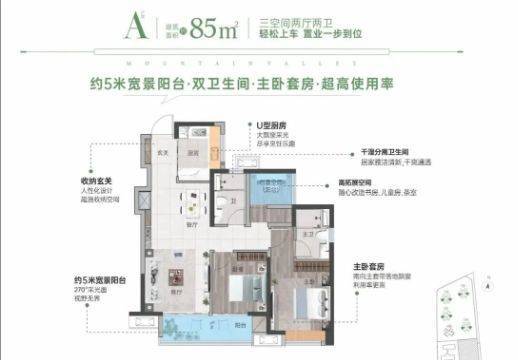 85㎡三房两卫:超5米宽南向阳台,全屋通透,适合年轻夫妻或三口之家;