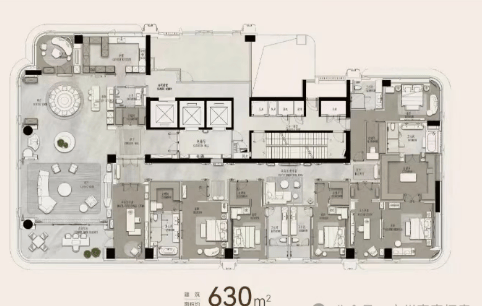 从204平方米至630平方米不等,户型设计灵活多变,满足不同家庭的需求。前排两栋楼以630平方米的大平层为主,每层仅设一户,提供极致私密性与舒适度;而后六栋超高层建筑则提供多种面积选择,最小204平方米,最大可达630平方米,每个房间都经过精心布局,力求最佳采光与视野。