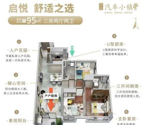 95㎡三房两卫:三开间朝南,双卫设计,适合三口之家;