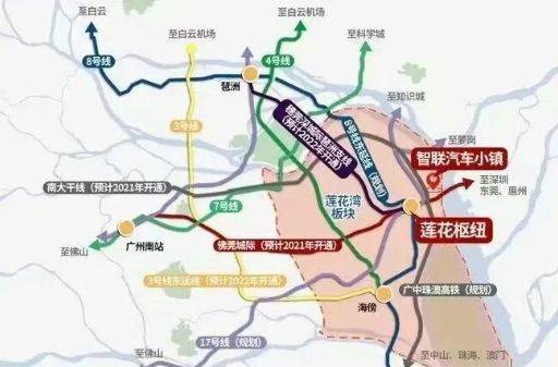 智联汽车小镇位于番禺东部莲花湾板块,地处琶洲以南约24公里,属于广州“东进南拓”战略的重要延伸区域。虽然目前尚未有地铁直达,但片区发展势头强劲,基础设施快速完善。