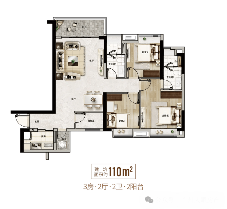 建面约110㎡四房户型,采用N+1灵动设计,空间可塑性强。户型南北通透,双阳台布局,生活阳台满足日常晾晒需求,景观阳台则可欣赏园林美景。多出的一间房间可根据家庭需求改造为书房、儿童房或储物间,适配家庭成长变化。主卧配备独立卫生间与衣帽间,保障私密性与舒适度,适合改善型家庭。