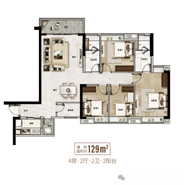 建面约129㎡四房户型,主打阔绰空间感,适合人口较多的家庭。户型南向面宽充足,客厅与餐厅相连,形成开阔的公共活动空间,便于家庭聚会。四间卧室均配备飘窗,采光通风俱佳;卫生间干湿分离设计,提升使用便捷性。精装交付涵盖品牌家电、优质瓷砖等,细节之处彰显品质。
