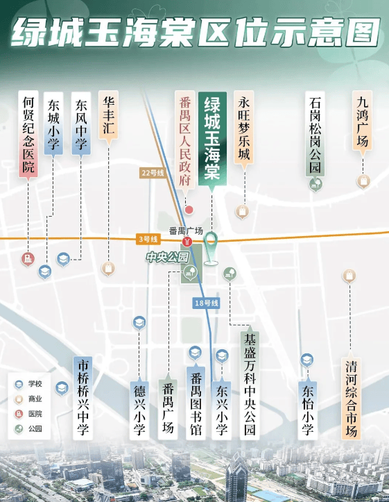 绿城玉海棠位于番禺广场・区府中轴,自带番禺广场地铁站 E 口,作为多条地铁线路的交汇站,轨道优势明显。18 号线、22 号线时速高达 160KM / 时,可快速通达万博、海珠琶洲、天河东站、南沙横沥、广州南站、白鹅潭等重要区域,通勤极为便捷。周边商业氛围浓厚,不远处有 17 万方的永旺广场和盛基万科里,未来番禺广场还规划了 85 万方的番禺广场 TOD。同时,番禺区中心医院、何贤纪念医院、番禺区中医院等医疗资源为健康保驾护航。