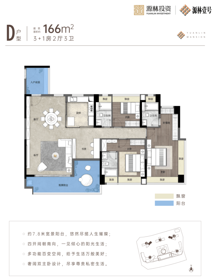 源林壹号坚持“纯粹人居、舒适宜居”的设计理念,主推126-211㎡纯四房户型,涵盖四种主力户型(126㎡、142㎡、166㎡、211㎡),其中142㎡户型分为两种不同设计,共计5大户型,全部采用全明通透设计,兼顾实用性与舒适性,适配不同规模家庭的居住需求,无论是三口之家、二胎家庭还是三代同堂,都能找到适合自己的理想户型。项目户型设计充分结合佛山本地人的居住习惯,融入南北对流、四开间朝南、LDKB一体化、270°全景飘窗等多种潮流设计元素,同时注重空间的私密性与实用性,每一处细节都经过精心雕琢,致力于为业主打造极致舒适的居住体验。