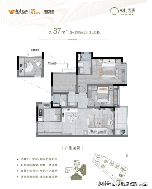 户型设计:87㎡三房两卫(绝版望江)、104㎡四房两卫(极致江景)、125㎡五房两卫(瞰江通透),得房率82%-85%。