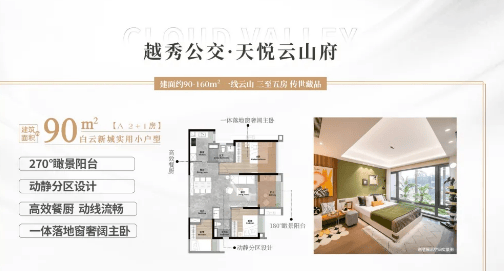 越秀・天悦云山府户型涵盖建面约 90 - 160㎡三至五房,精装交付,装修标准对标万博 CBD 和樾府,配备全屋智能化系统、六大收纳系统、客厅主卧风管机及国际品牌设施,提升居住舒适度。其中,160㎡五房三卫户型采用南北通透双阳台设计,瞰景阳台约 6.9 米,五开间朝南,主卧带独立衣帽间,空间宽敞实用;C7 栋小高层产品更是亮点突出,仅 19 层,共 108 户,梯户比相当于高层产品 2T3 户,居住私密性与舒适性更高。90㎡南向产品拥有超宽楼间距,可眺望中心园林;125㎡户型则能享受一线云山景观,是白云山豪宅圈中少有的不超过 144㎡无遮挡云山景观产品,满足不同家庭的居住偏好。