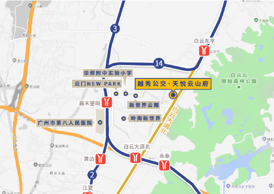 越秀・天悦云山府坐落于白云新城北部,紧邻白云大道,地处广州中芯五区规划的第二个 CBD—— 白云新城板块。十四五期间,白云新城累计投入超 1100 亿,致力于打造国际交往中心、城市枢纽门户等多功能区域,发展潜力十足。交通方面,项目距离地铁 14 号线白云东平站约 1.7 公里,在建的 18 号线北延段步行约 25 分钟、骑电动车约 8 分钟可达,未来搭乘 18 号线 2 站可到广州东站,3 站直达珠江新城。同时,项目创新打造公交 TOD 模式,整体抬高 18 米,业主从小区电梯可直达楼下公交站,无缝接驳地铁 2 号线、3 号线、14 号线(二期在建)等线路,轻松通达珠江新城、体育西等核心商圈,有效解决 “最后一公里” 出行难题。