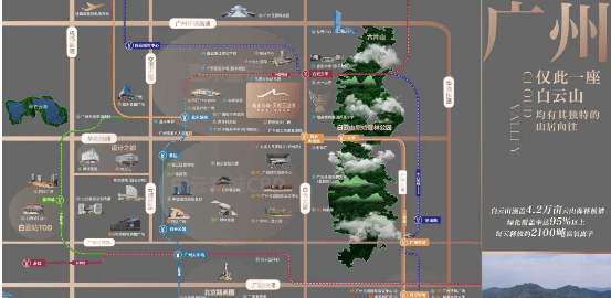 越秀・天悦云山府距离 5A 级景区白云山仅 120 米,三面无遮挡,业主在家即可欣赏白云山美景,享受清新自然的空气,契合高端宜居理念。商业配套方面,项目 3 公里内拥有超 200 万㎡繁华商业圈,云门 NEW PARK 商场、云悦里广场、百世商业广场等大型商业体汇聚,品牌餐饮零售、大型超市及五星级新世界芊丽酒店已入驻,满足业主购物、餐饮、娱乐等多样化消费需求,无需远行就能享受便捷的都市生活,整体生活品质较高,为居民打造了集自然景观与繁华商业于一体的优质生活环境。