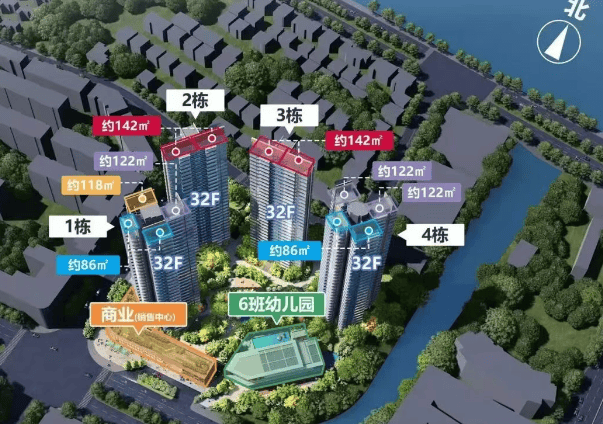 项目包括4栋住宅楼,其中2栋为塔楼设计,2栋为板楼设计。塔楼每层设4户,涵盖建面约86-118-122㎡的户型;板楼每层设2户,全部为建面约142㎡的大户型。交房时间为2026年12月。户型特点如下: