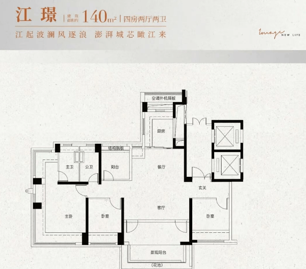 建面约140㎡:大四房两厅两卫,北向一线望江,稀缺板楼设计,专梯专户,尊享高贵。
