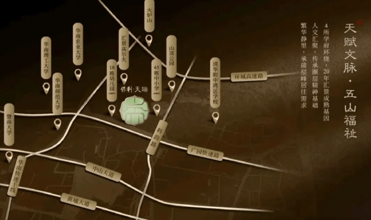 项目位于天河五山汇景新城板块核心位置,占地面积约 15.5 万方,建筑面积约 33 万方,容积率 2.93。规划 17 栋住宅,包括 8 - 20F 小高层,配建 18 班幼儿园及 45 班九年制学校,还有约 6.8 万㎡中式园林、3000 方商业及自带庭院会所,涵盖瑜伽室、休闲区、泳池等设施,满足业主休闲、教育、生活等多方面需求。