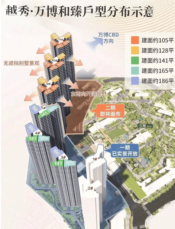越秀・万博城 | 和臻产权年限 70 年,建筑类型为塔楼。首开组团占地面积 23200 平米,建筑面积 88500 平米,容积率 3.81,绿化率 35.1%,车位配比 1:1.78,得房率达 100 - 120%,采用精装修交付,由越秀物业提供服务,物业费 4.5 元 / 月 / 平米。整个万博城约 500 万平,分为 CBD 组团、东 / 西部组团、南部组团。其中,CBD 组团(首推组团)位置最佳,靠近万博商务区,被锦绣香江别墅群环绕,居住环境宁静舒适。