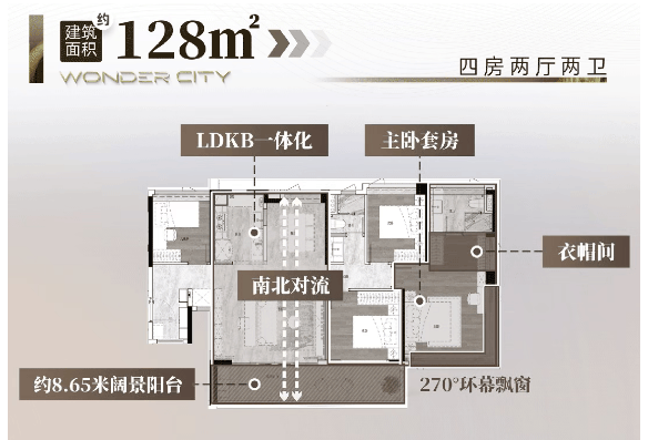 一期在售建面约 122 - 186 平南向阔景四房,实现南向超大面宽与巨幕阳台设计,还有柔性定制 N + 1 大方厅、南北对流大主套等亮点。即将推出的二期超新规 120% 使用率,主推建面约 105 平及 128 平四房。建面约 105㎡户型四开间朝南,LDKB 一体化,5.9m 开间巨幕客厅,主卧 270° 全景飘窗。建面约 128㎡户型南北对流,超 14m 南向面宽,净宽 5.05m 巨幕宽厅,8.65 米 IMAX 阔景阳台,主卧 270° 全景飘窗与步入式衣帽间,居住品质全面提升。