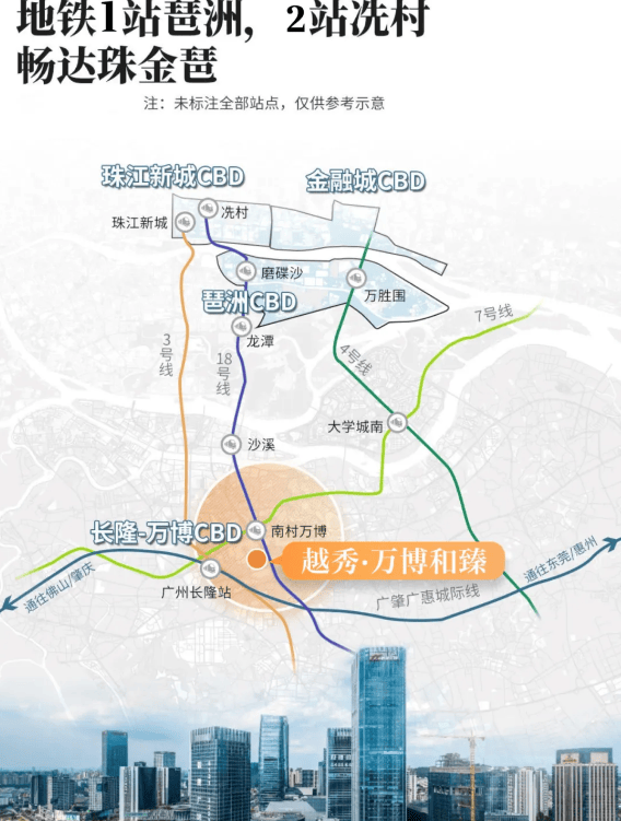 项目首发 CBD 组团 F1 - 2 地块位于锦绣香江别墅群中间,与万博商务区直线距离约 600 米。虽步行至南村万博 E1 口约 1.3 公里,但南村万博站为 7 号线与 18 号线交汇站,可一站直达广州南站、老黄埔、科学城、琶洲、珠江新城等地,交通便捷,轻松畅行广州各大核心区域。