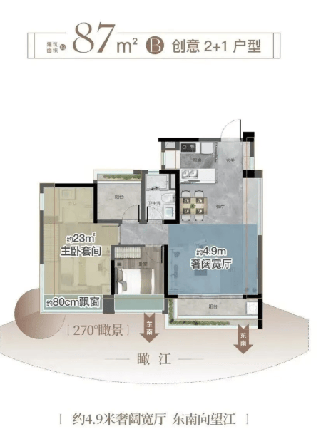 87B户型:罕见4.9米宽幕客厅,23㎡酒店式主卧,实用率达110%;