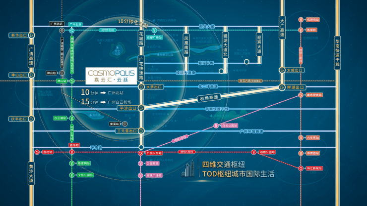 **『嘉华国际·嘉云汇』**位于广州白云北广花创新核芯居住区,紧邻白云区南面,沿广花快速路可直达白云新城。项目北面是花都湖湿地公园,周边还有亚太地区较大的TOD综合交通枢纽之一广州北站以及国内三大航空枢纽之一白云机场。项目距离地铁9号线清布站仅一步之遥,未来还将规划地铁8号线北延段、广清城轨和穗莞深城轨,真正实现了广州、大湾区生活圈的无缝对接。