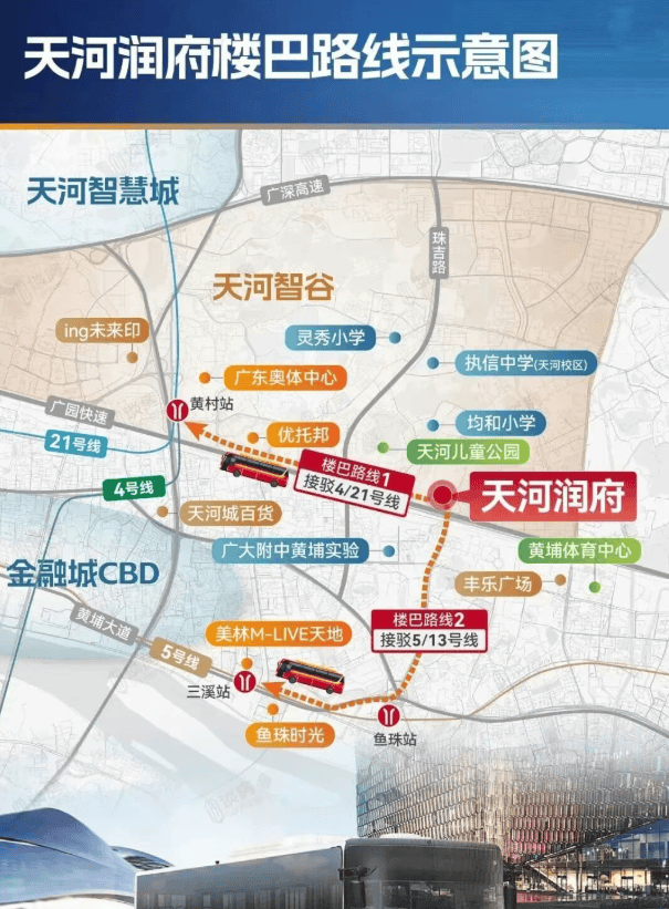 路线2:直达鱼珠-三溪商圈,衔接地铁5号线、13号线鱼珠站,3站即达金融城,7站直抵珠江新城。