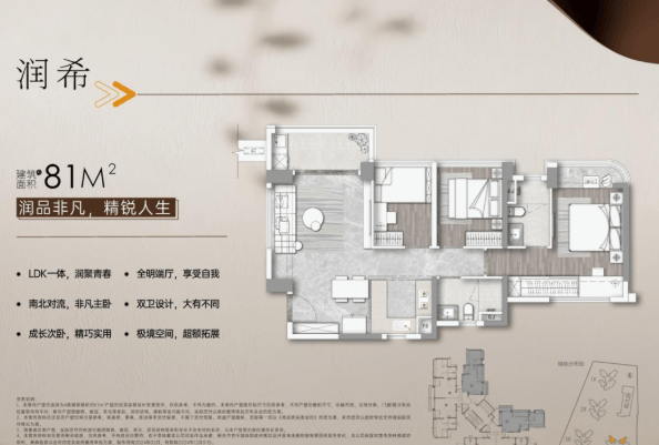所有户型实用率均超100%,真正做到“买得少、用得多”。例如81㎡户型实现三面采光,90㎡户型做到四开间朝南,空间通透敞亮。二期产品更升级为“润心底盘2.0”,围绕玄关、客餐厅、厨房、卧室、卫浴五大生活场景深度优化收纳、动线与尺度,并融入全屋智能系统,打造“会呼吸的健康之家”。