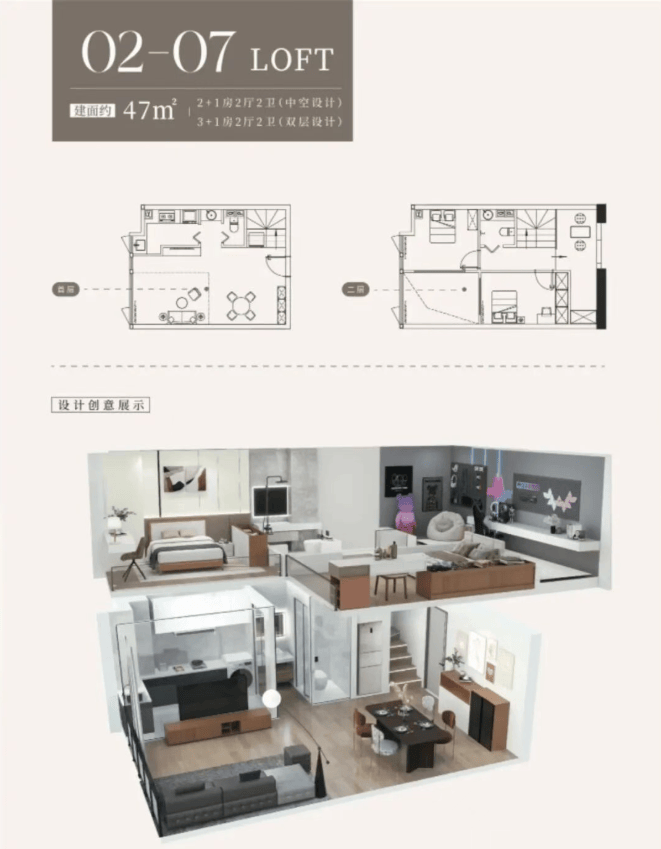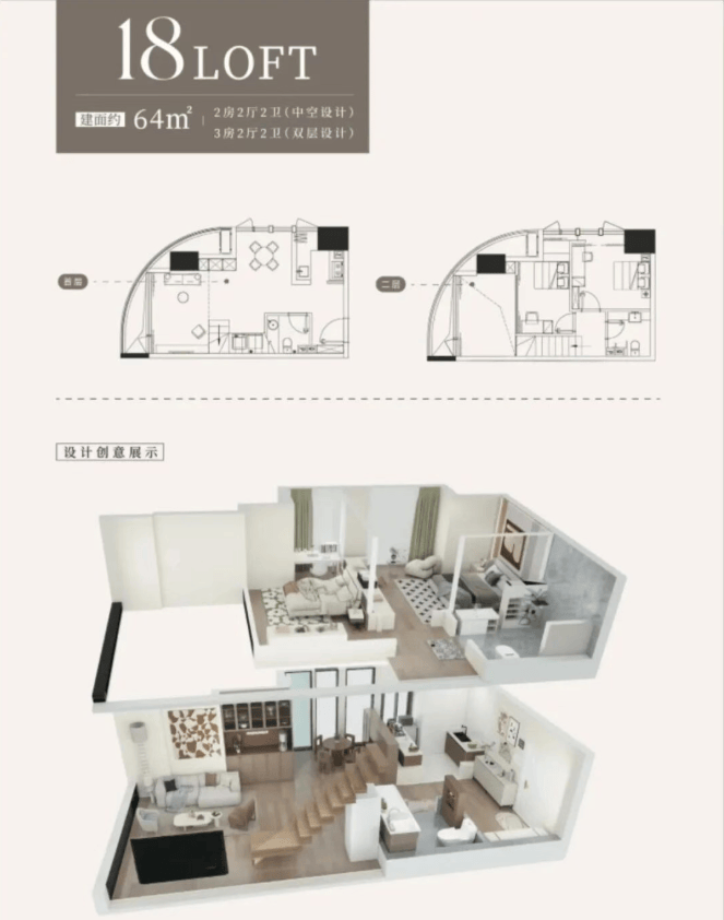 此外,还有6-9层高,5米层高的LOFT公寓,面积从约46-85平方米不等,通燃气可明火,设计灵活多样。
