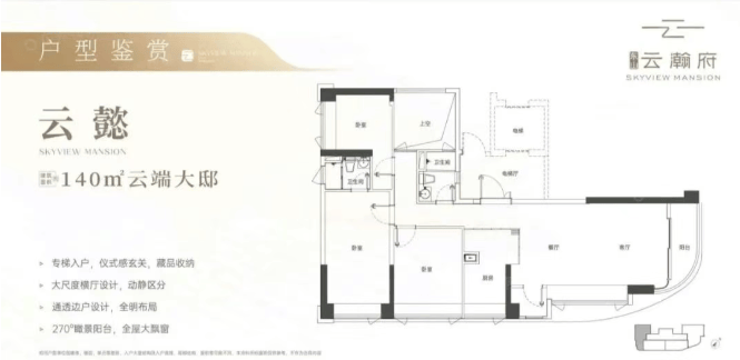 140㎡南向4房:六开间朝南,超17米南向面宽,四面采光单边户。